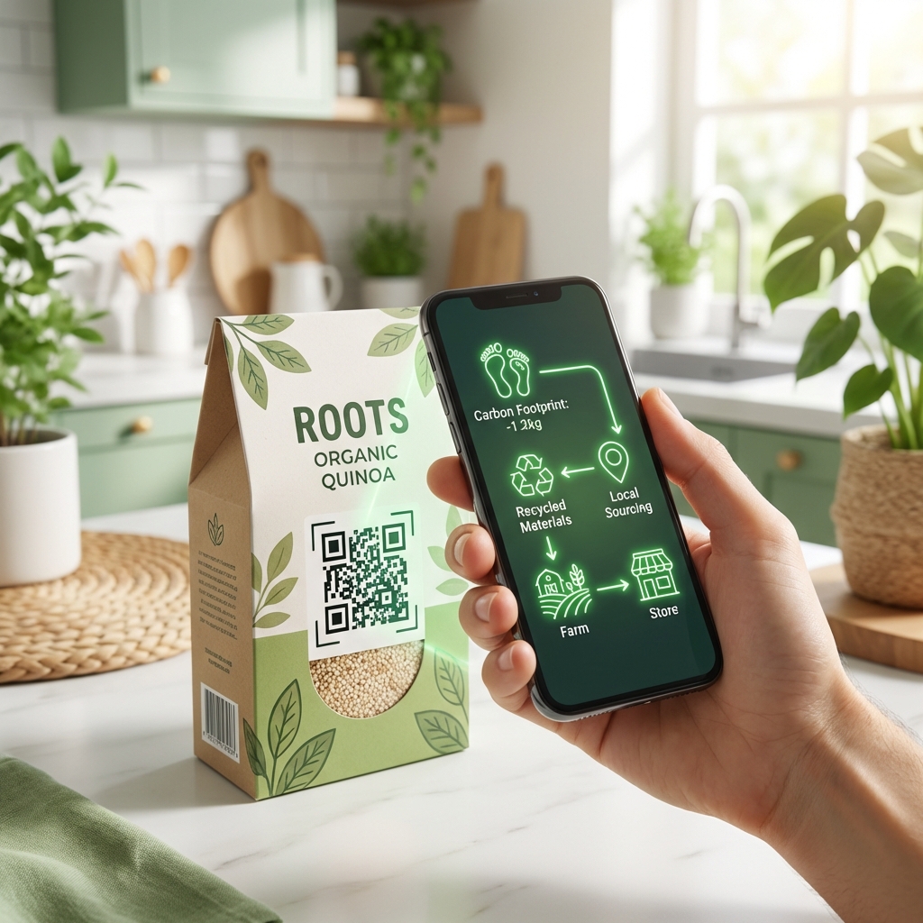 Umweltbewusstes Lieferketten-Tracking. Verbraucher scannen, um den CO2-Fußabdruck eines Produkts, Recyclingmaterialien und Nachhaltigkeitsmetriken zu sehen. Transparenz schafft Vertrauen.